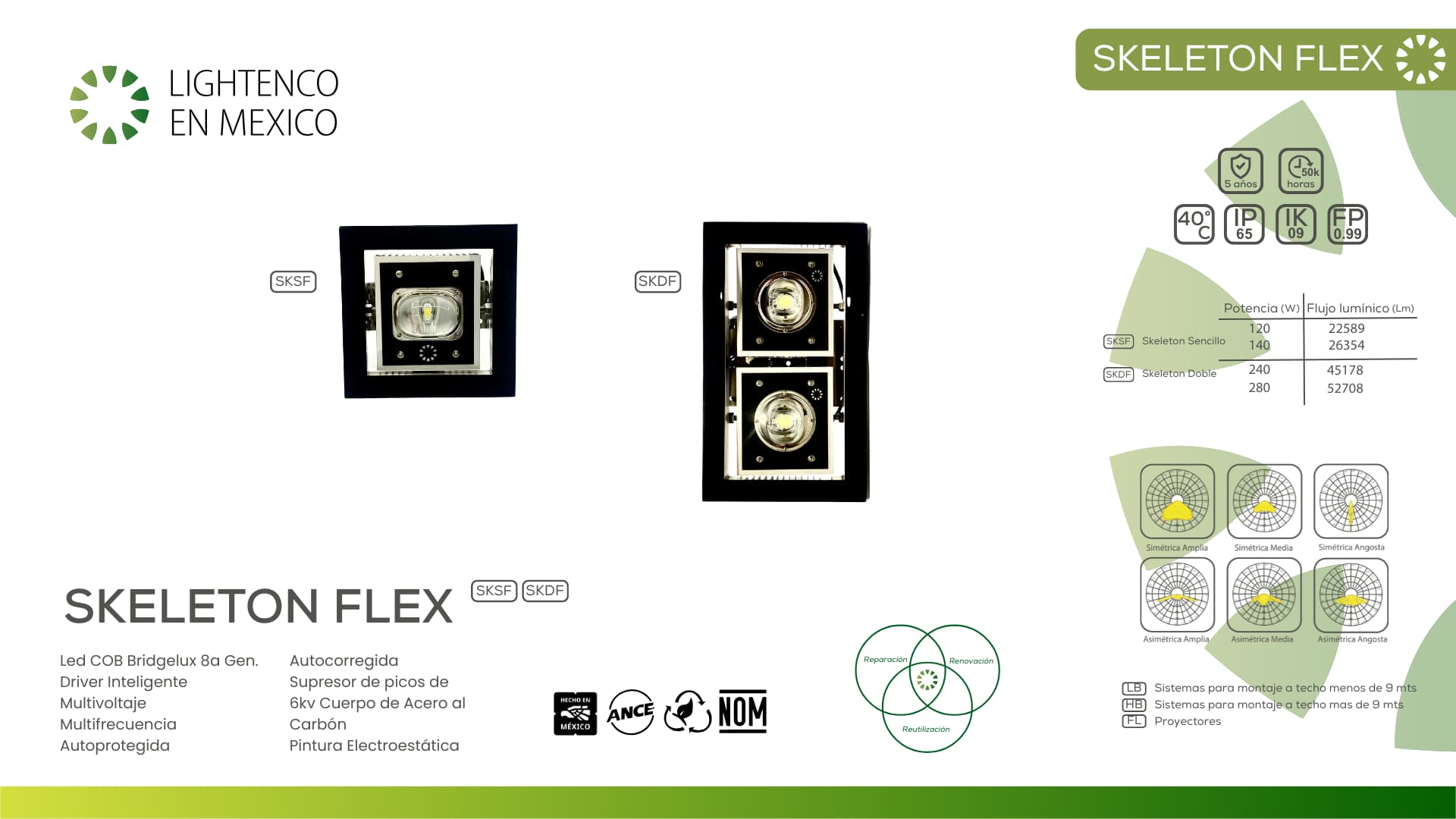 - Las ópticas para la Skeleton Flex se sugieren con base en el requerimiento específico del cliente. Ya que la aplicación de ésta varía en relación al proyecto que se desea llevar a cabo.